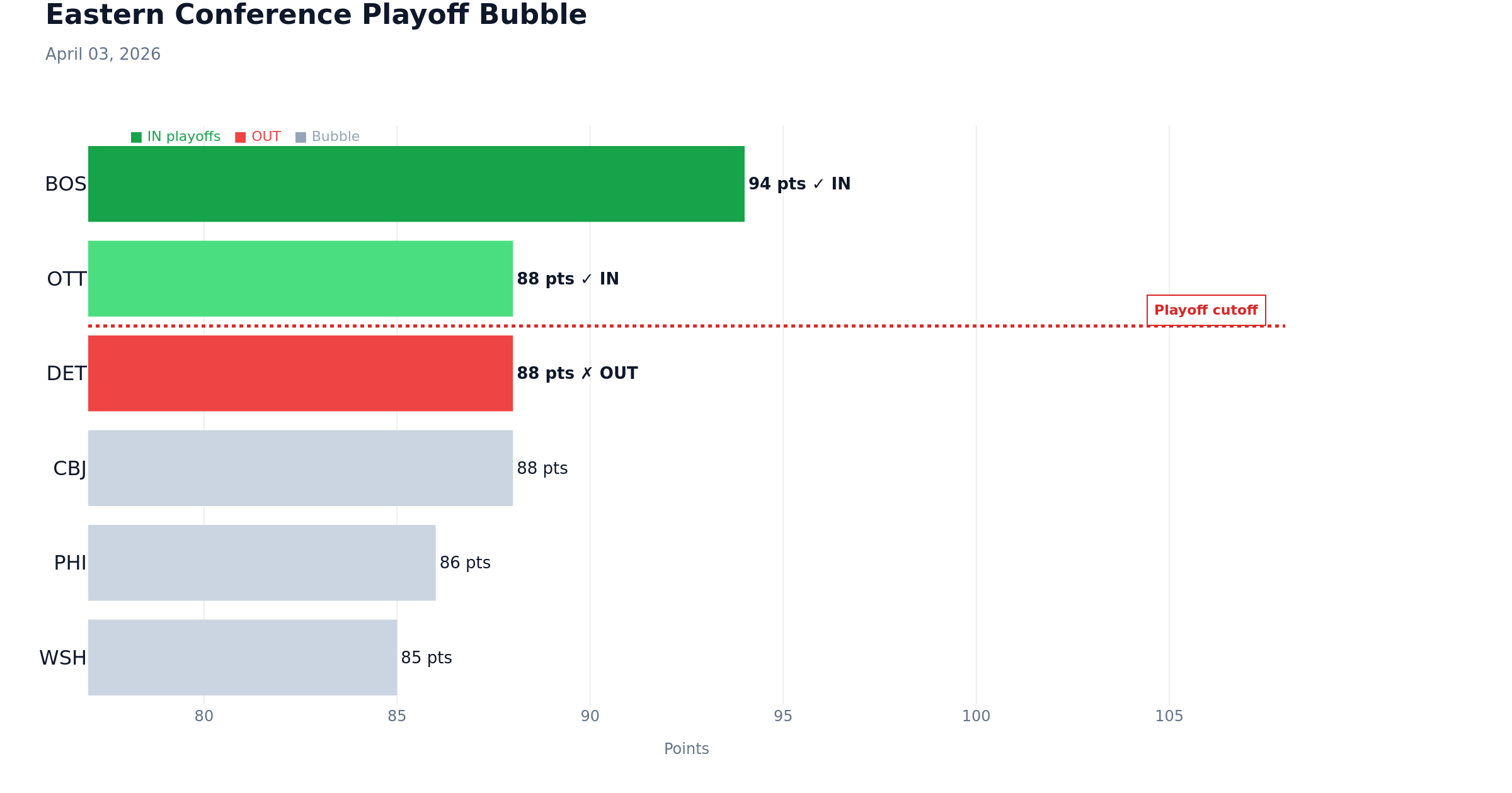 The current playoff cutoff line has the Bruins (BOS) at 94 points, with the Senators (OTT) clinging to the last wild card spot at 88 points. The Red Wings (DET), Blue Jackets (CBJ), Flyers (PHI), and Capitals (WSH) are all on the outside looking in, with 88, 88, 86, and 85 points, respectively.