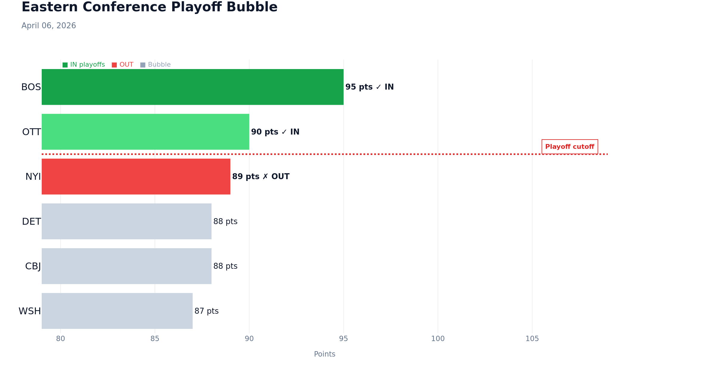 The current playoff cutoff line has the Bruins (BOS) and Senators (OTT) in the wild card spots with 95 and 90 points, respectively. The Islanders (NYI) are on the outside with 89 points, while the Red Wings (DET) and Blue Jackets (CBJ) are close behind with 88 points each. The Capitals (WSH) are still in the mix with 87 points.